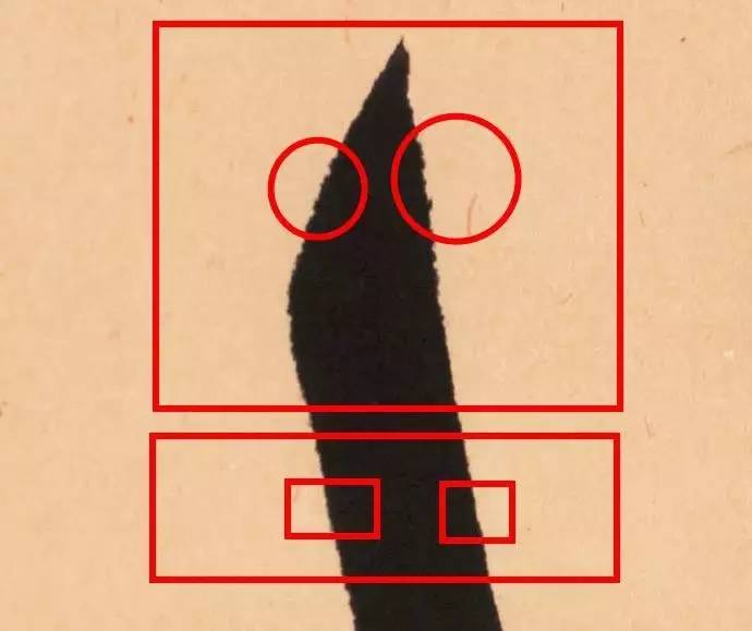 為了表述更清楚,我還是把筆畫放大跟您說吧。上圖中,上邊大紅框標注的就是起筆部位,大家注意看紅色圈圈裏筆畫的周邊,會有輕微洇開。調鋒行筆,筆內墨汁減少之後,就不會洇了。也就是上圖下邊長方形紅框所標注的,大家細看這個紅框中兩個小紅框標注的部位,基本不會有洇開的情況。