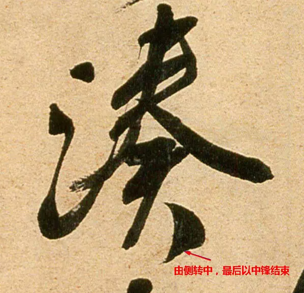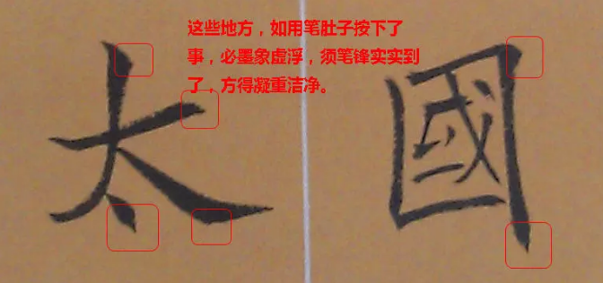 任何一點一畫,從始至終,四面八方,都應是筆鋒運走形成的。如寫一點頓下後,須頓中有提,使筆鋒走至原筆腹按下的位置,使筆力充分作用於紙面,如此方得收筆處堅實凝重的筆觸。