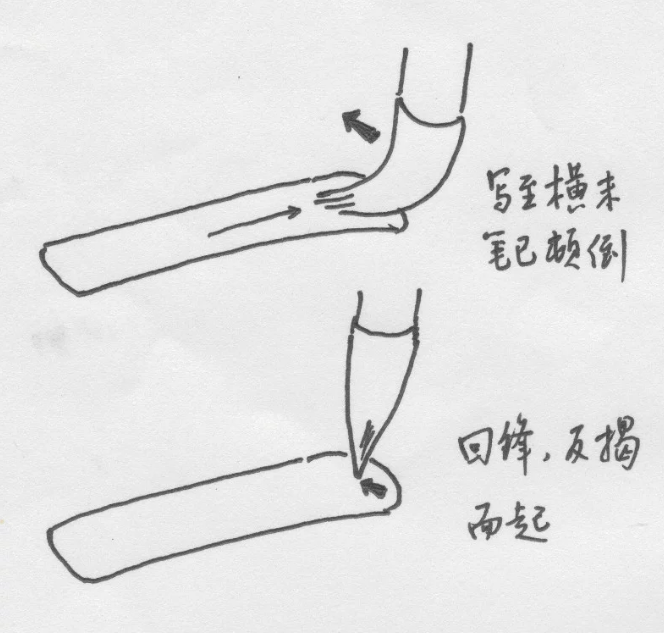 一種是回鋒反彈,回鋒時正好逆著行筆方向提筆,將筆鋒回頂彈直,所以回鋒動作正確與否,應看筆鋒是最有效地彈直順利齊。
