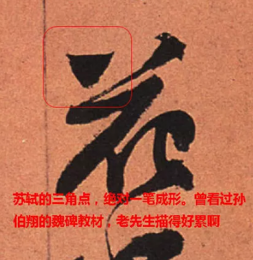 挑點,為追求三角方棱的形態特征,逐個角地依次填填滿,特別是專門去填b處第二個角,類於畫字而不是寫字,筆畫形象呆滯造作,極不自然。這種運筆是不足取的。理由是:①畫字不是寫字,筆畫造作不自然;②速度太慢,沒有筆勢可言;③古人運筆絕不是這樣的。