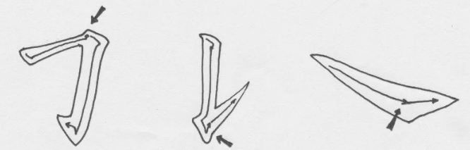 (2)筆剛頓即反挫撐起,筆腹離紙,筆毫沿上下方向平整展開(下展溢出的筆鋒自然的形成b處勁利的棱角,絕不需刻意描畫)。