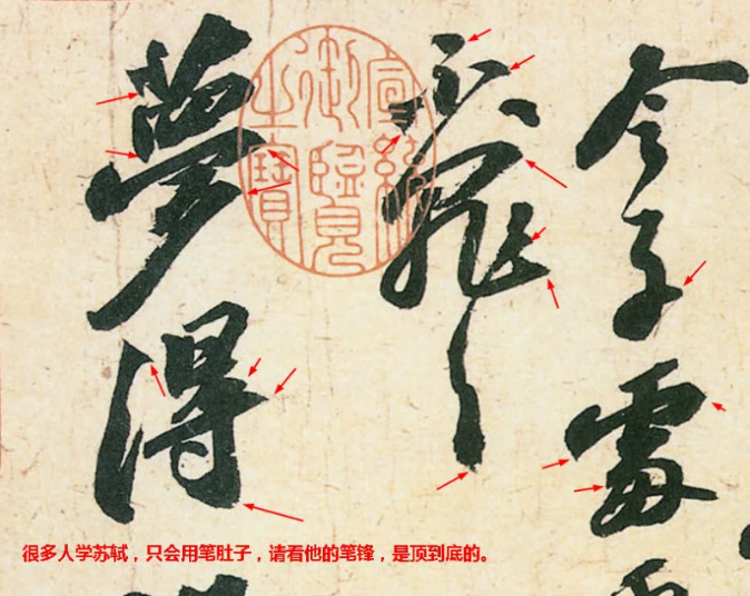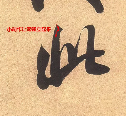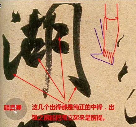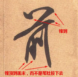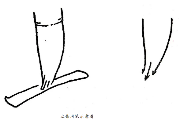 筆毫的末梢——鋒,是筆力集中到達,墨水集中流注的地方。善用筆者,能使筆站起來以鋒芒運使,這叫“立鋒”,筆鋒挺而健,有效得傳達指腕的力量。在曲張之間“殺”入紙中,獲得力透紙背,入木三分的效果,如不能發揮鋒的用場,單以筆腹掃頓按,筆畫必質感薄弱,墨象虛浮。