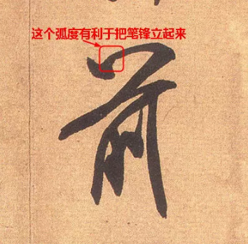 如圖,寫到心鉤的出鉤處,為保證出鉤時的中鋒效果,不懂得八面出鋒原理者,須將筆鋒作120度左右的大幅度調向,其艱難繁複可想而知,而且筆鋒易曲扭,缺乏彈性,影響筆畫力度,懂得八面出鋒的,隻須稍回頂立起筆鋒,換以左上面反勁出鋒,即可得飽滿勁利的鉤狀,熟練時,幾時看不出行筆有停頓。