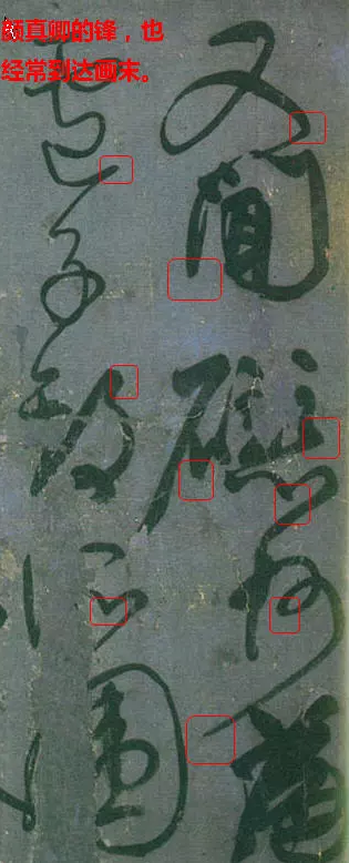 理論上所說的筆鋒的頂端,實際運用上,鋒指的是鋒端及筆毫近的那一段,再遠些就是筆腰,筆腰是筆毫產生彈性的部位,也有不少書家慣用筆腰,如顏真卿等,“力點”常不在鋒而在筆腰,腰一觸紙即能彈走,所以頓重而能清勁。可惜很多學他的人,一頓即倒腰軟無力,外形相似而神情大異。近代康有為,筆腹腰也運用得很精彩。