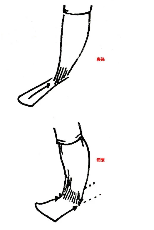 由於運筆順逆用勁的不同,中鋒有裹鋒、鋪毫的細微區別: