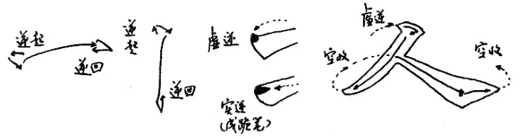 逆鋒有時表現為“虛”的形式,如露鋒的起筆,要在空中“虛逆”,出鋒的收筆,要在筆離紙後在空中回收,虛逆和“空收”均在空中作逆勢,是假動作的,不要忽略這個假動作,空中作勢形成的沉著質地,意味雋永,是直入直出地運筆無法比擬的,學書者隨著功力的加深,自然明白其間玄妙。