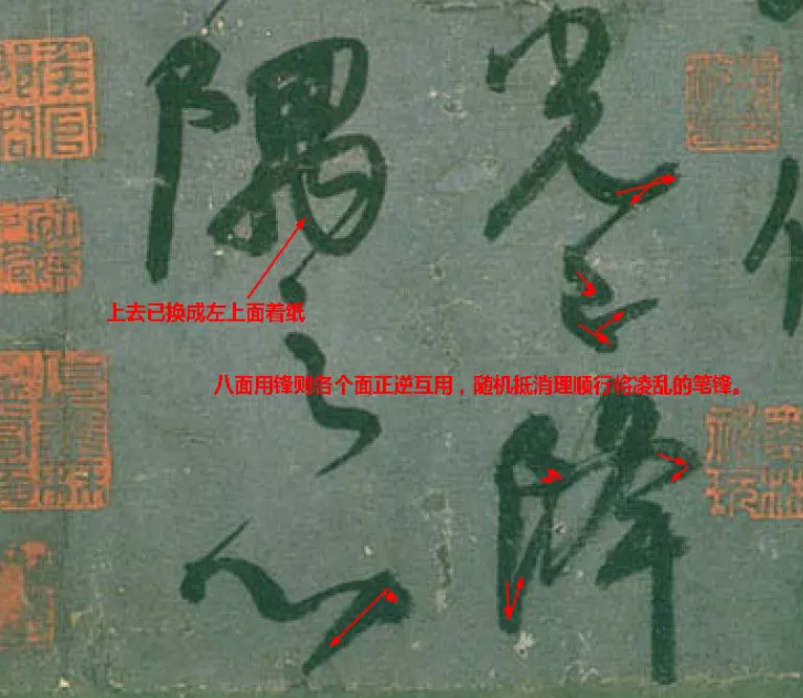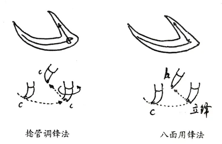 八面用鋒的原則,指筆向不同的方向走動,應施以相應的筆畫著紙運行。