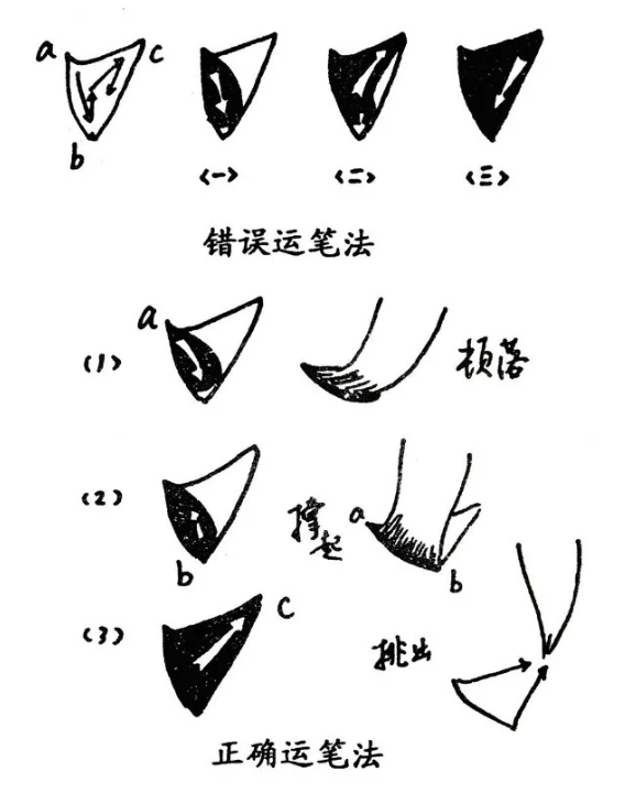 以上運筆熟練之後,隻需一按一提即成,不過這提按的刹那之間,暗藏了個挫鋒動作,使筆鋒能一按提起,由聚而鋪,再由鋪而聚,這面需要有極其良好的控製筆毫的能力。