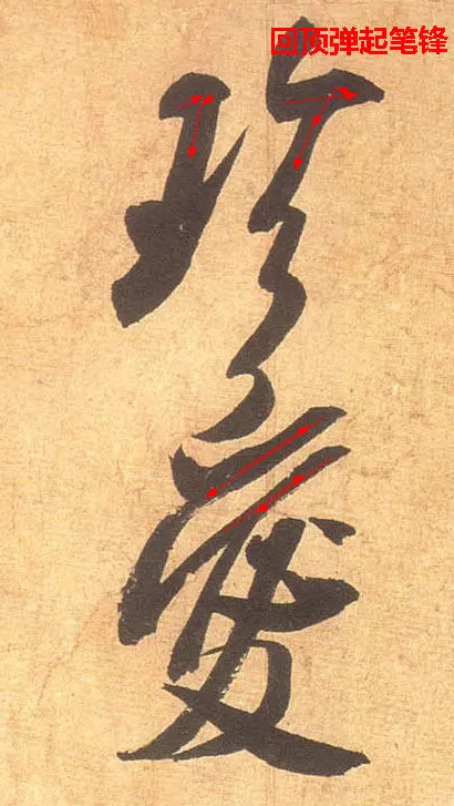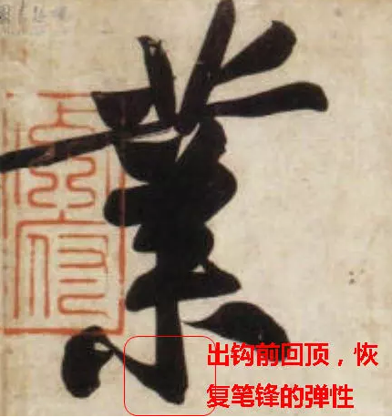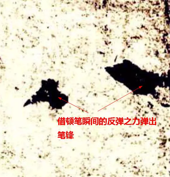 筆往前運走,就免不了要倒下來,彈性就會慚弱下去,需做個“回頂”的動作立起筆鋒,如折角處的挫鋒,挑鉤處的蹲鋒,捺底出鋒前的微微回縮(所謂挫、蹲、回,都是回頂用勁的一種),均使散敗的毛筆在一定的程度得以複原立起,甚至使筆處於特殊的強勁狀態,錚錚欲彈走,大大增強了“筆力”。