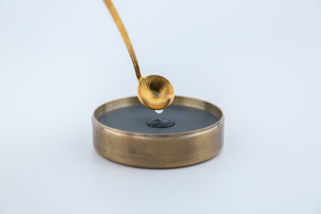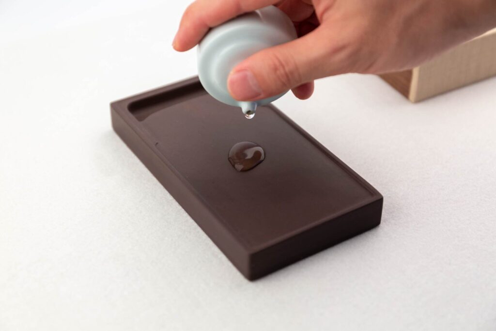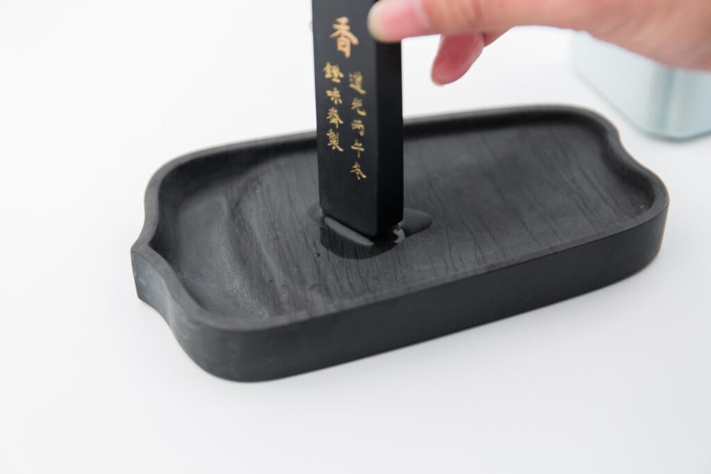 然後用墨條先蘸水,潤濕一下磨口,靜置一分鍾後開始打圈或來回推磨