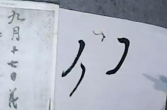 那一撇用筆的右上麵著紙。