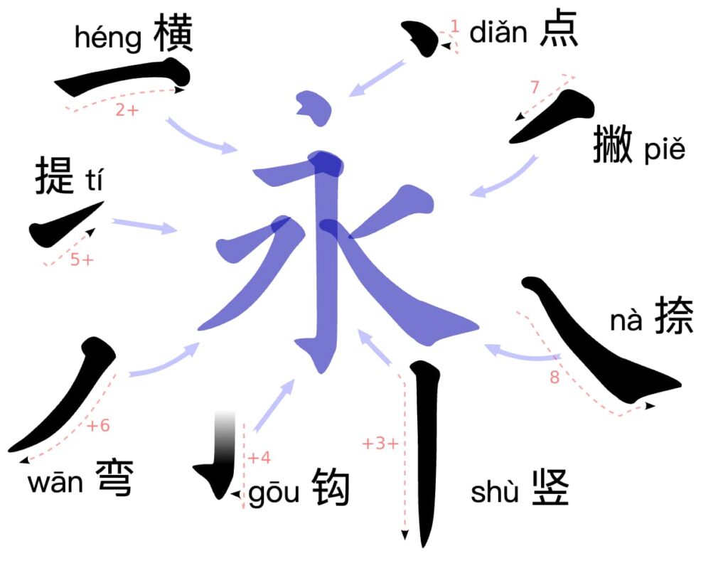 - 啄(橫撇): 啄同「喙」,謂寫橫撇應如鳥以喙啄食,行筆快速,筆鋒峻利,與長撇有所不同。