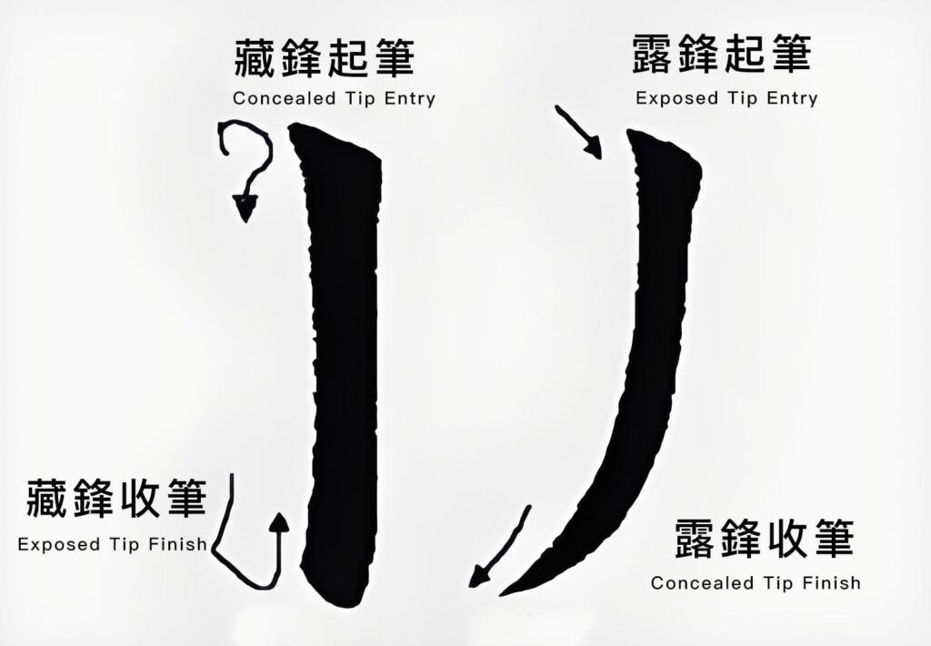 筆鋒自空中落紙,看入紙點是落在筆畫之內還是之外。入紙點在筆畫之內,就是藏鋒,入紙點在點畫之外,就是露鋒。