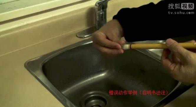 黃簡老師在視頻中介紹的是直接打開水龍頭並把毛筆放在水流中衝洗的方法,這個和我之前發布的文章《怎樣洗毛筆?(節約水且不弄髒水池的洗筆方法)》很不一樣。如上圖所示。注意,很多家庭的水龍頭都有冷熱水,但是洗毛筆請一定用冷水(夏天用冷水,冬天用溫水也是可以的——啟明注)。
